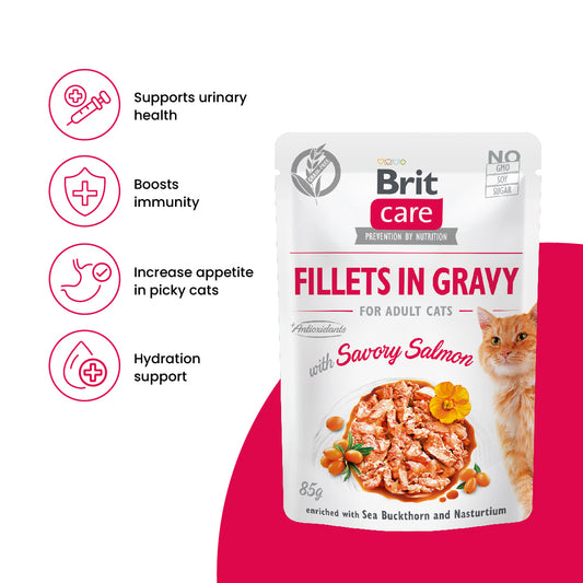 Brit Care Cat Fillets in Gravy with Savory Salmon 85g Carton (24 Pouches)