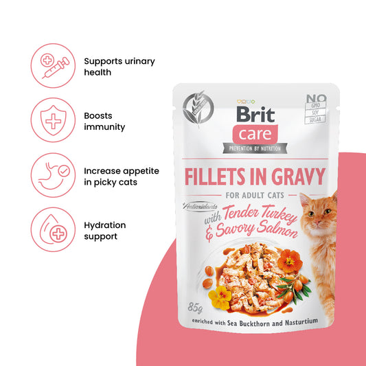Brit Care Cat Fillets in Gravy With Tender Turkey & Savory Salmon 85g Carton (24 Pouches)